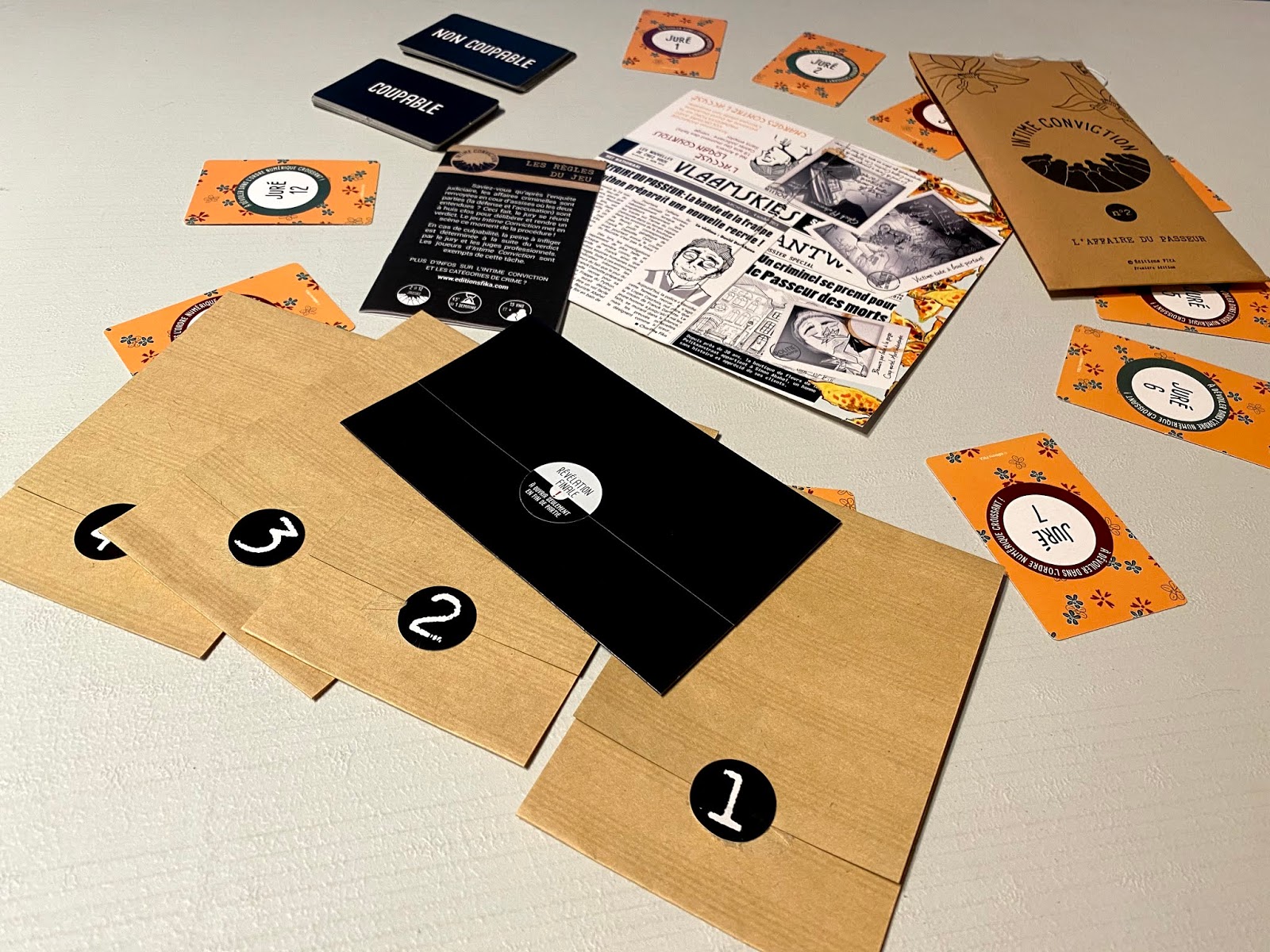 Je trouve qu’encore une fois, l’Ă©volution de la partie va vraiment faire Ă©voluer votre avis. Et oĂč par exemple en dĂ©but de partie, votre avis Ă©tait arrĂȘtĂ© Ă l’Ă©noncĂ© des faits, vous commencerez Ă douter voire mĂȘme Ă changer d’avis… L’expĂ©rience ludique, oui je trouve que l’expĂ©rience ludique est un bon terme pour dĂ©crire ce jeu, est rĂ©ussie et l’objectif d’Ă©prouver votre intime conviction est totalement atteint !
