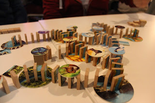 Lorsque vous le posez, gardez toujours à l’esprit qu’après les 20 minutes de pose, un joueur poussera le premier domino sur la tuile Départ afin de faire tomber la totalité (enfin, si vous avez de la chance) des autres. Placez-les dans le bon sens, de sorte à ce que le côté illustré du domino soit visible une fois qu’il sera tombé. Soyez aussi fort vigilant lorsque vous poserez ceux-ci, si malencontreusement vous faites tomber quelque chose, il vous faudra tout remettre en place, vous perdrez donc du temps.