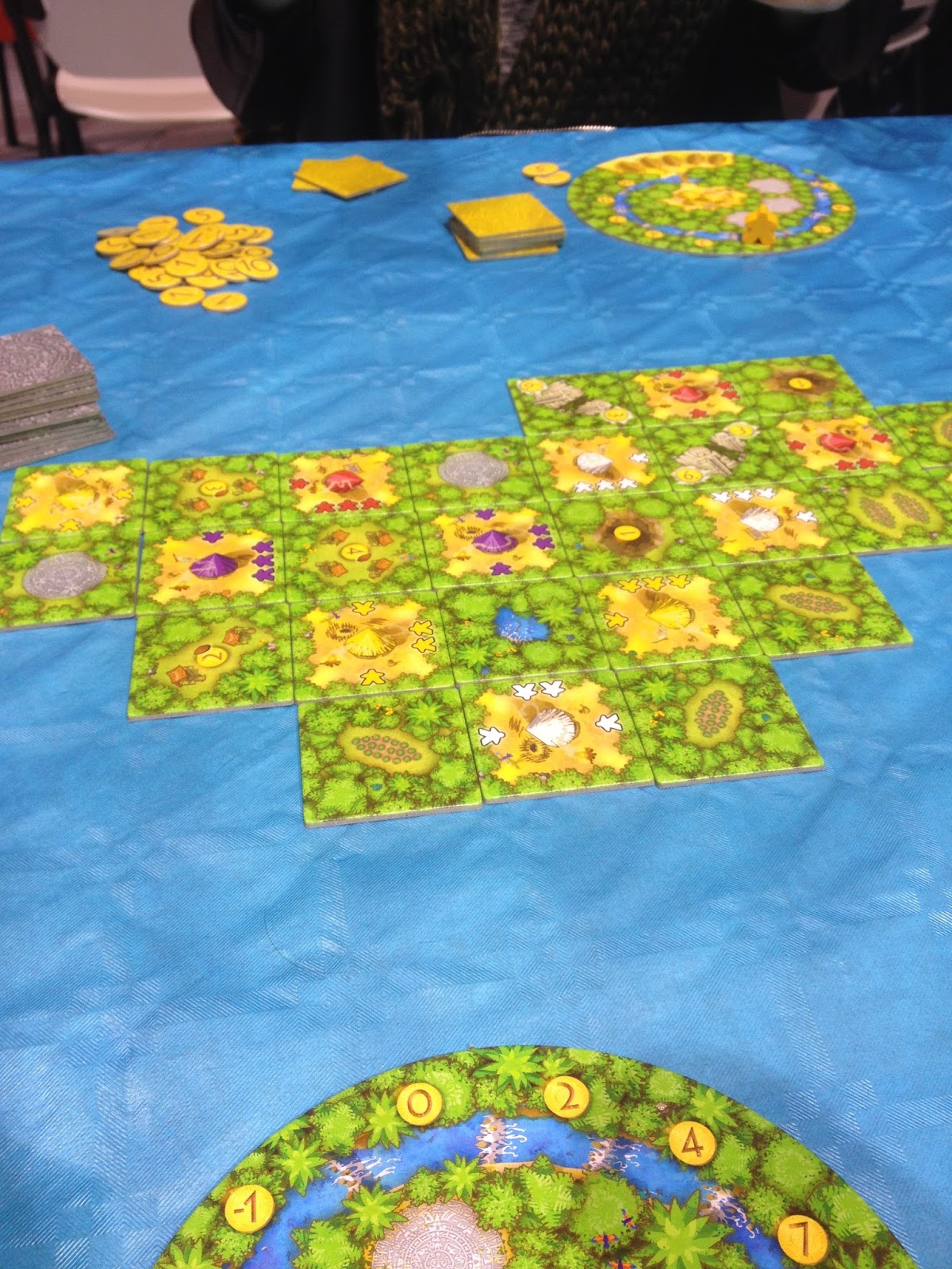 Lors de vos placements de tuiles, vous aurez la possibilité de récupérer des pièces jaunes (qui font office de PV), des fèves de cacao, des pièces grises qui vous donneront plus tard la possibilité de rejouer sur une de vos tuiles ou de gagner un PV, d’avancer sur l’échelle de rivière (et donc de gagner des PV), de se réserver une place autour d’un temple pour gagner des PV supplémentaires en fin de partie, mais aussi et surtout de vendre vos fèves de cacao.