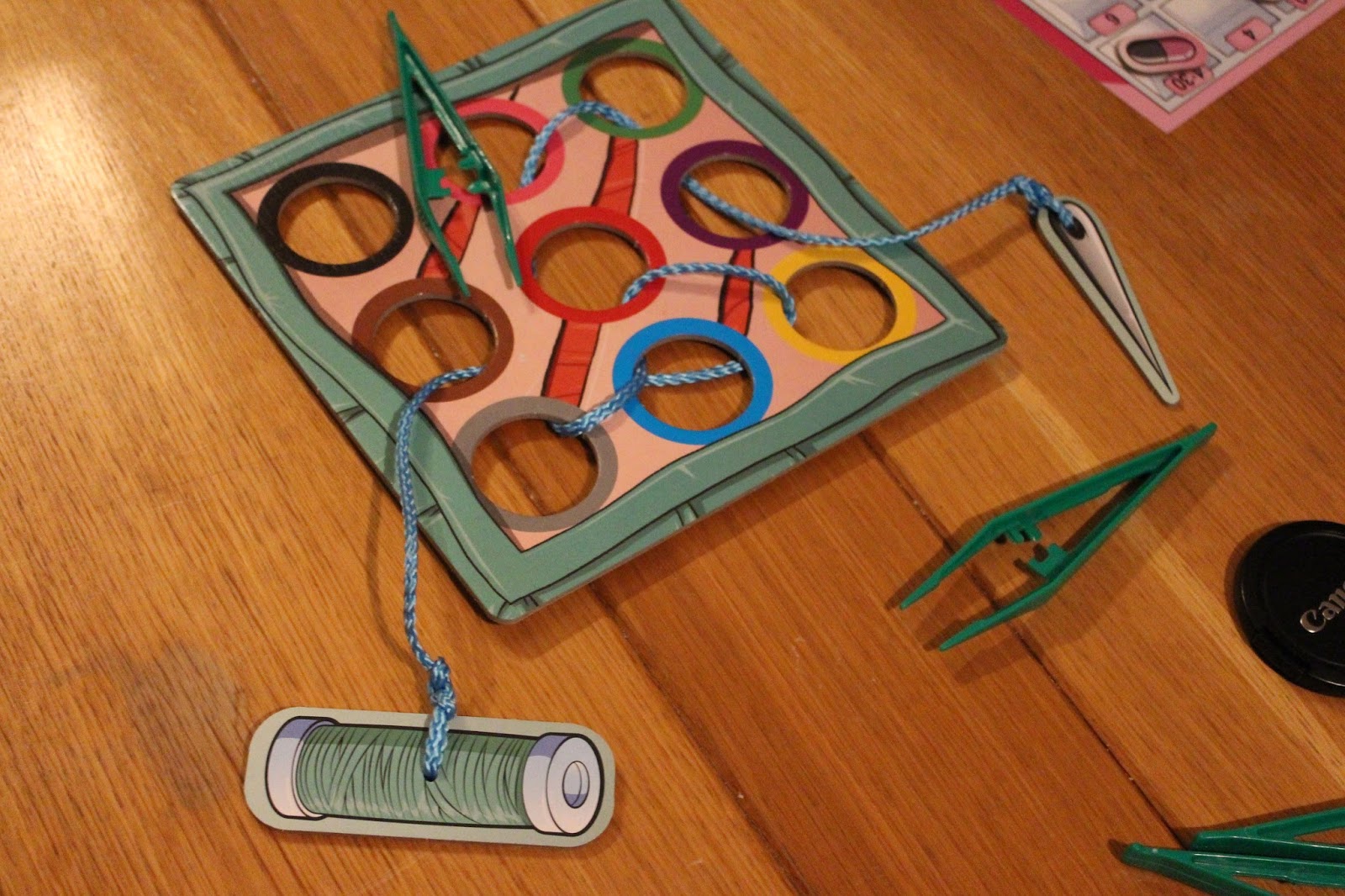 # Suture : le responsable doit indiquer le schéma de suture à l’équipier. Celui-ci doit faire entrer et sortir une aiguille dans les trous de la bonne couleur pour réaliser le parcours. Et pour simplifier le tout, la suture doit être réalisée à l’aide de 2 pinces, l’aiguille ne peut jamais être en contact avec les doigts.