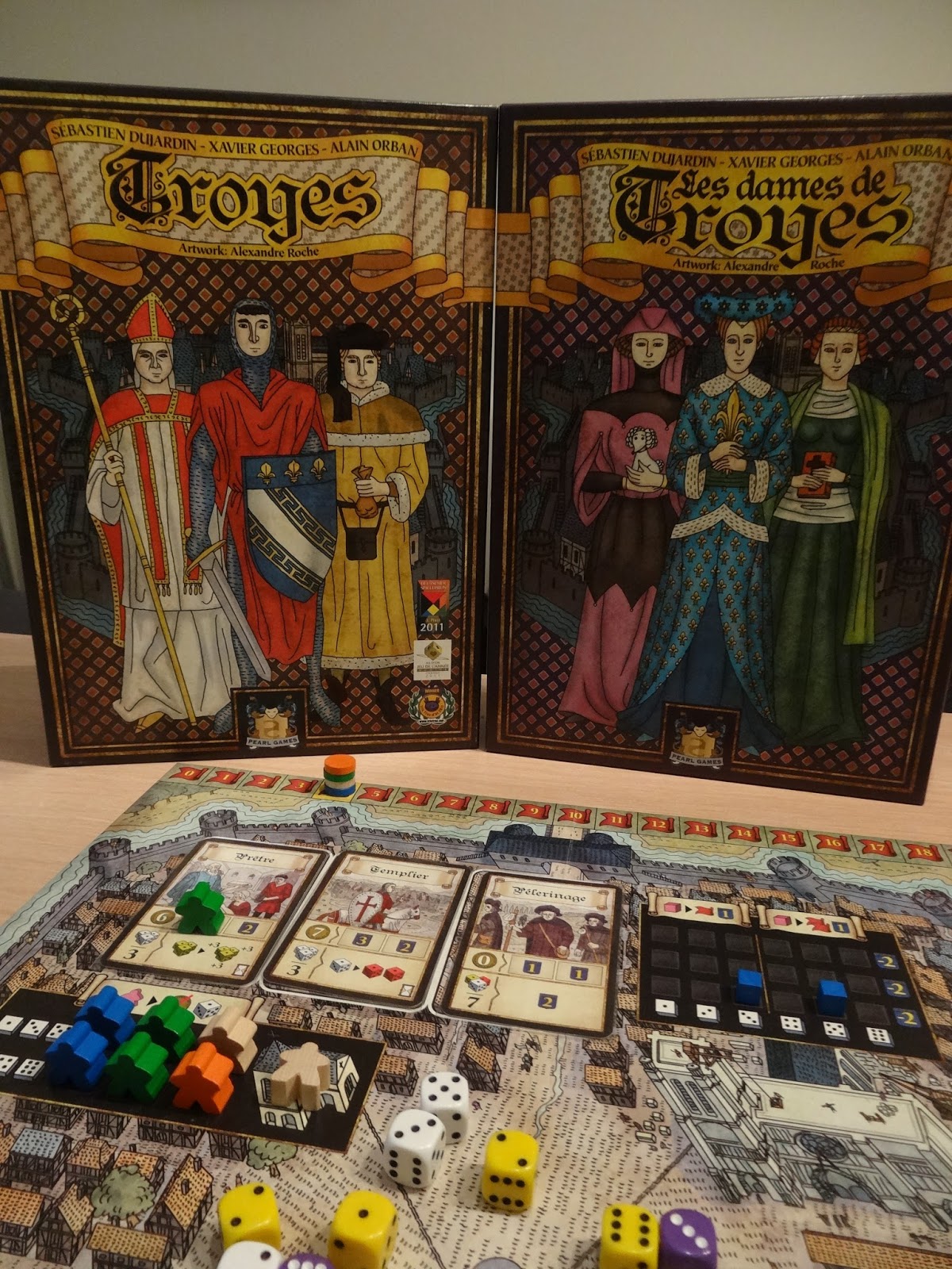Pour moi, Troyes, c’est un MUST-HAVE dans une ludothèque de bons gros joueurs aimant les jeux de gestion. C’est un jeu dense, touffu. Il demande un certain investissement car la première partie est souvent biaisé par la non-maîtrise de la piste d’influence ou encore par la possibilité d’acheter les dés de ses adversaires. Il faut aussi quelques tours pour s’adapter aux cartes et à l’iconographie qui n’est pas très claire pour certaines cartes. Et si jamais, vous n’avez pas le cœur à attendre la ré-édition, vous pouvez toujours vous ruer sur la version en ligne disponible sur BoardGameArena.