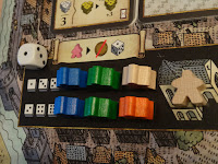 Les 2 premières phases sont très rapides : vous recevez 10 deniers et vous payez les ouvriers que vous avez placé dans les différents quartiers (tout travail mérite salaire). Ensuite, chaque joueur lance ses dés qu’il place dans sa zone du plateau. Voilà, on peut passer aux choses sérieuses maintenant :