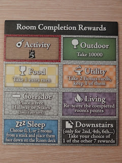 On a évidemment l’effet inverse avec certaines tuiles, les tuiles rouges dites les tuiles « activités », vous feront perdre des PV si jamais un des murs de cette pièce touche la pièce du type indiqué au centre.
