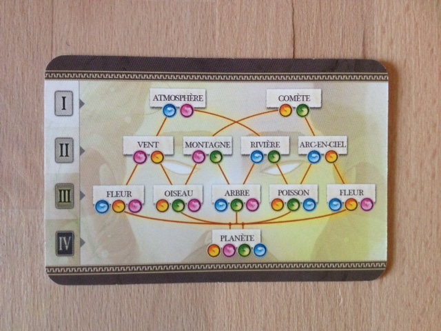Par exemple au 1er tout, le 1er joueur doit indispensablement poser l’Atmosphère ou la Comète. Le second doit jouer une carte « Élément » avec une couleur correspondante à celle posée par le 1er joueur, et ainsi que suite (ou poser l’autre carte « Nature » du niveau I qui n’a pas encore été posée), ça augmente vos possibilités).
