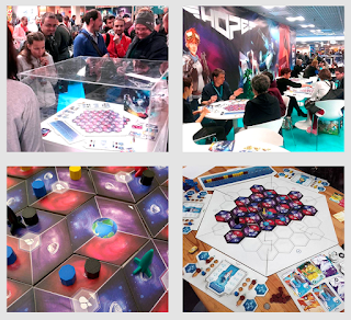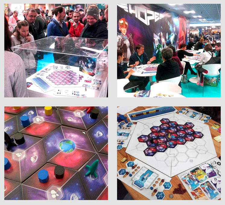 Ça fait 6 ans depuis la genèse du jeu. Il a créé une première version en 2010 sans règles qu’il a offert à sa belle-sœur pour Noël (déjà avec les 36 tuiles). Et c’était au Festival EnJeux de la même année qu’il montrait à Etienne Espreman (Auteur de Bruxelles 1893 et un des boss de Geek Attitude Games) un premier cube en 3D sur le lequel le jeu est basé. A l’origine, le thème est « des lapins qui sautent sur des cubes ». Le jeu est ensuite présenté (après écriture des règles et développement d’une autre backstory « cosmique ») au concours CNJ de Boulogne-Billancourt où il est primé. Et alors qu’il allait abandonner le concept, le voilà signé sur Morning Players avec remaniement de la thématique et du développement de l’univers.