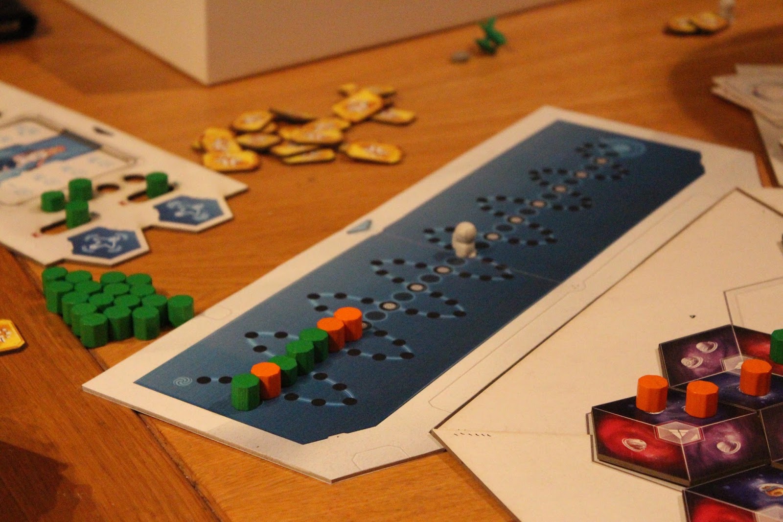 Nous sommes dans un jeu semi-coopératif où il faudra coopérer pour stabiliser des planètes à l’aide de nos pionniers qui apporteront la technologie nécessaire à cette stabilisation. Une fois la chose faite, ces pionniers sont enlevés des planètes et placés sur le « Plateau Mission » qui fonctionne également comme compte-tour. En effet, c’est un peu une course contre le temps qui nous attend, nous devons atteindre la fin de la piste du plateau avant le « Marqueur de Régression » auquel cas, ce sera la défaite, excepté pour le traître qui aura peut-être infiltré nos rangs. En fin de partie, si nous gagnons notre course contre le Marqueur de Régression, il n’y aura qu’un seul vainqueur (semi-coopératif, je vous le rappelle) et vous l’aurez deviné, celui qui aura le plus de pionniers de sa couleur sur le Plateau Mission sera le gagnant de la partie.