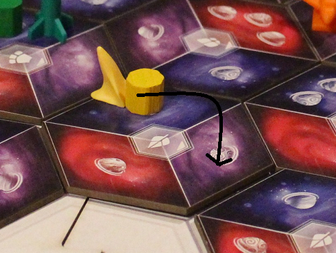 Dans cet exemple, la navette jaune se trouve dans la dimension rouge et réalise un mouvement « vers le pôle d’attraction ». Elle a donc 2 possibilités de déplacement comme représenté sur la photo. Lors de ce déplacement, la navette jaune peut s’arrêter sur n’importe quelle dimension rouge de son trajet. |