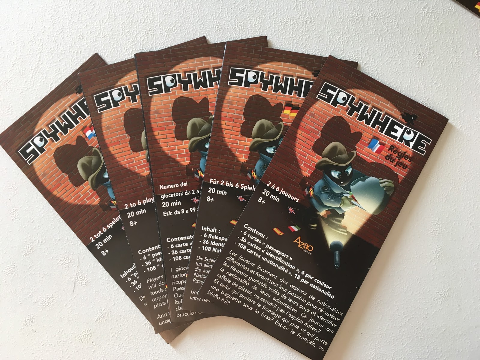 A 2 joueurs, chacun reçoit 2 « passeport », et on joue avec les 6 nationalités, la partie prend fin lorsque la pioche est épuisée ou qu’un des 2 joueurs a posé 2 identifications chez l’adversaire. Aucune tentative d’identification n’est possible avant le 5ème tour. Personnellement, je n’ai pas accroché à ce format, je n’en vois pas l’intérêt et le jeu y perd tout son attrait, je ne vous le conseille donc pas pour deux.
