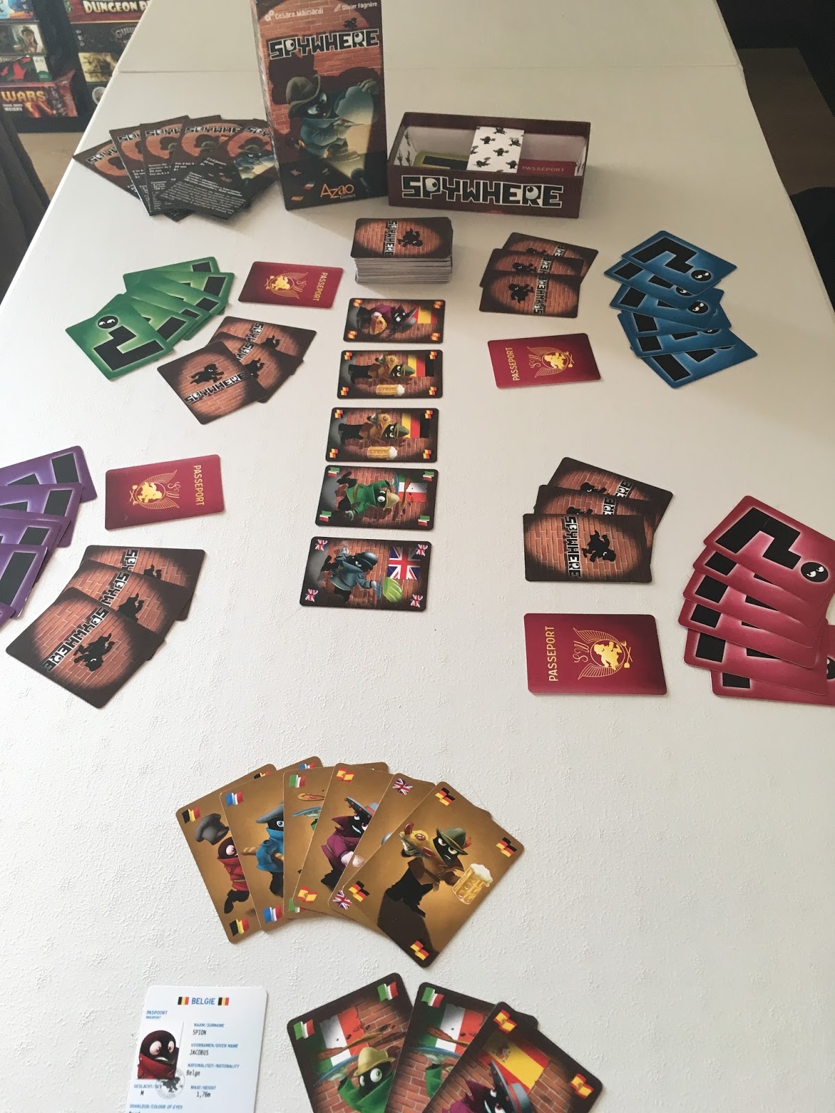 Il y a 6 espions de nationalités différentes (ayant chacun une carte « passeport » le représentant), le jeu peut donc se jouer jusque 6 personnes, qui reçoit chacune une carte « passeport » qu’il garde évidement secrète. Chaque joueur reçoit également une série de cartes « identification » représentant les 6 nations, il choisira sa couleur de prédilection parmi les 6 séries.