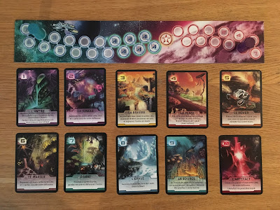 En dessous de la piste de score, les 10 cartes « Lieu » sont placées en 2 rangées (de 1 à 5 – lieux de base : L’antre, La jungle, La rivière, La plage, Le rover et de 6 à 10 – nouveaux lieux en cours de jeu : Le marais, L’abris, L’épave, La source, L’artefact). A noter que les cartes « Lieu » sont adjacentes horizontalement et verticalement.