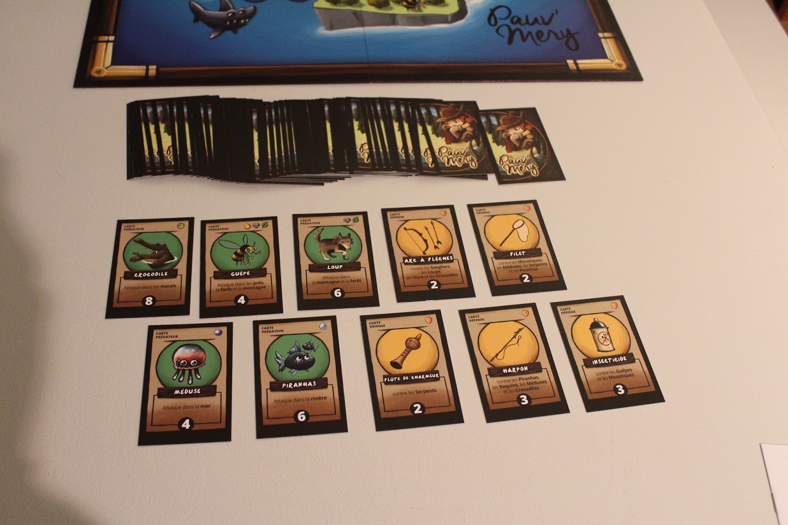 Ces cartes sont : ou des animaux qui vous permettront d’attaquer vos adversaires, ceci avec des valeurs différentes (ex. : le moustique vaut 2, le requin vaut 8), ou des cartes qui vous permettront de vous défendre de ces attaques, elles aussi contenant des valeurs (ex. : une tapette à mouche contre un moustique, un filet de pêche contre un piranha, etc.).