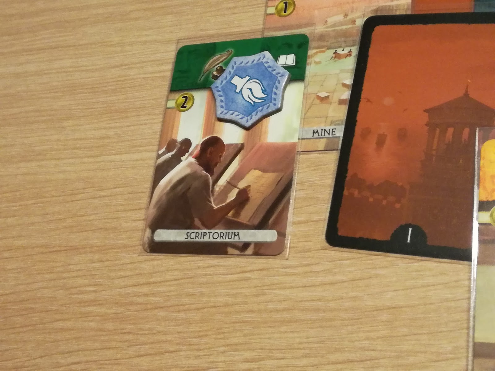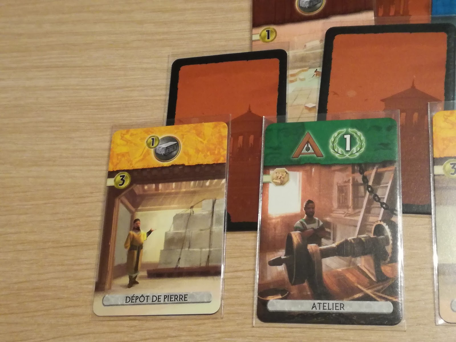 – Construire un bâtiment de la pyramide et le placer dans sa zone de jeu : Comme d’habitude, il faudra s’acquitter du coût indiqué sur la carte ou respecter les règles de chaînage. Petite subtilité : on n’achète plus les ressources manquantes à son voisin mais bien à la banque. Par contre, si votre adversaire possède, par exemple, un bâtiment produisant de la pierre, vous achèterez votre pierre non pas pour 2 sous mais 3 et 4 si il possède 2 symboles de la ressource voulue et ainsi de suite.
