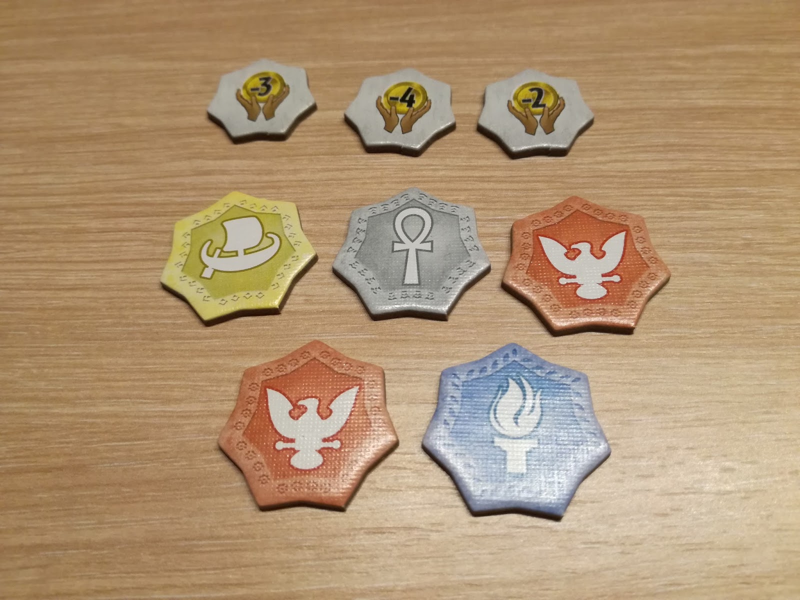 Lors de l’âge 2, des jetons offrandes seront placés sur la pyramide. Ces jetons offrandes peuvent être récupérées comme les jetons mythologie et permettront au joueur qui les récupère d’obtenir une réduction du coût demandé pour récupérer une Divinité.