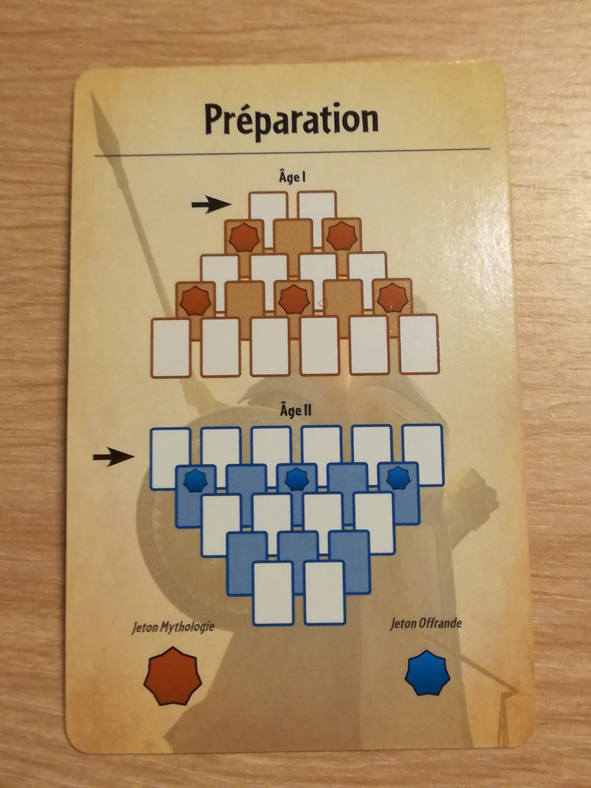 La mise en place de la pyramide est identique, à l’exception du fait que l’on va placer, face cachée, des Jetons Mythologie comme indiqué sur l’image ci-dessous.