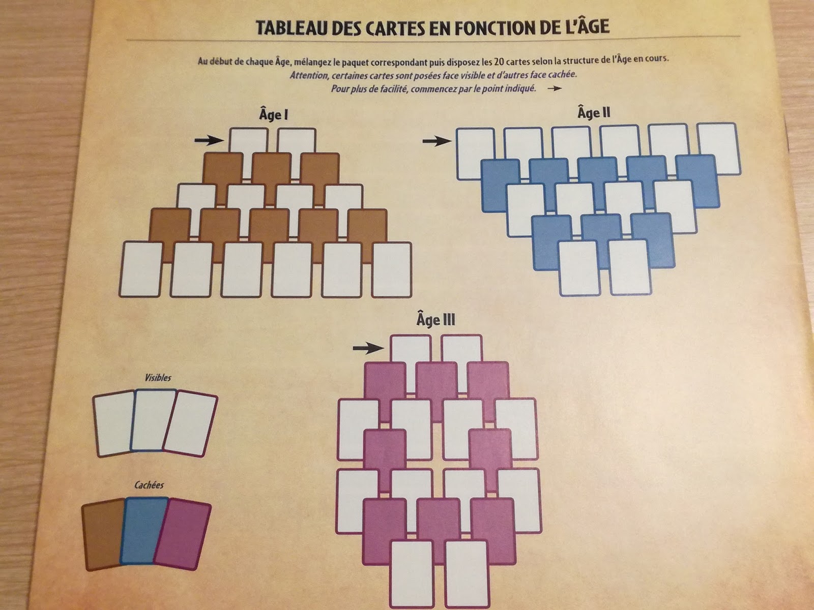 Tout comme dans son grand frère, 7WD se déroule sur 3 âges durant lesquels les joueurs ne vont pas effectuer un draft mais bien une sélection de cartes présentes dans une pyramide assez astucieuse qui simule cet effet de draft qui a fait le succès de 7 Wonders.