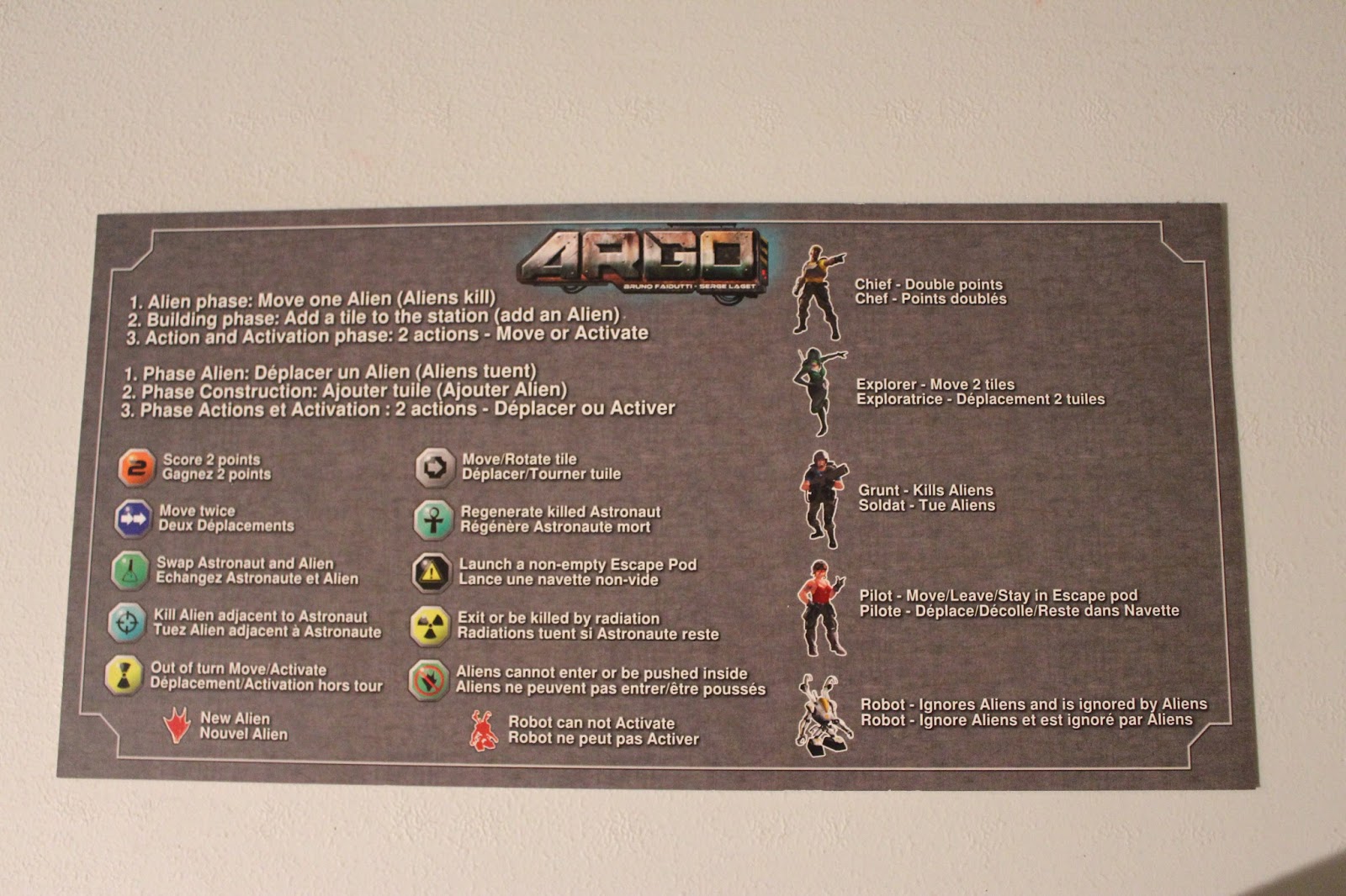 Chaque joueur contrôle une équipe d’astronautes, le but est simple : sauver un maximum de vos astronautes en trouvant des navettes pour évacuer la station Argo.