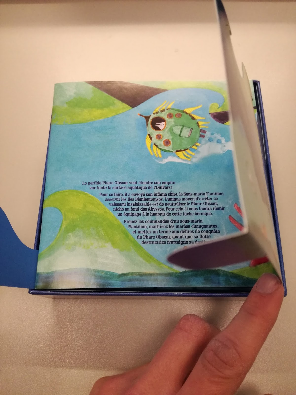 Comme quasiment tous les jeux de la gamme (Onirim, Equilibrion, Sylvion et Castellion) du même auteur belge, Nautilion est un jeu qui se pratique en solitaire ou en duo. Les règles sont très simples : pour gagner, il vous faudra atteindre les abysses avant que le sous-marin fantôme n’atteigne les îles Bienheureuses. Mais pas que, car il vous faudra également avoir recruté les 9 membres d’équipage nécessaires au bon fonctionnement de votre sous-marin. Heureusement, vous avez pensé à prendre votre Grimoire de sorts avec vous, il vous sera peut-être utile.
