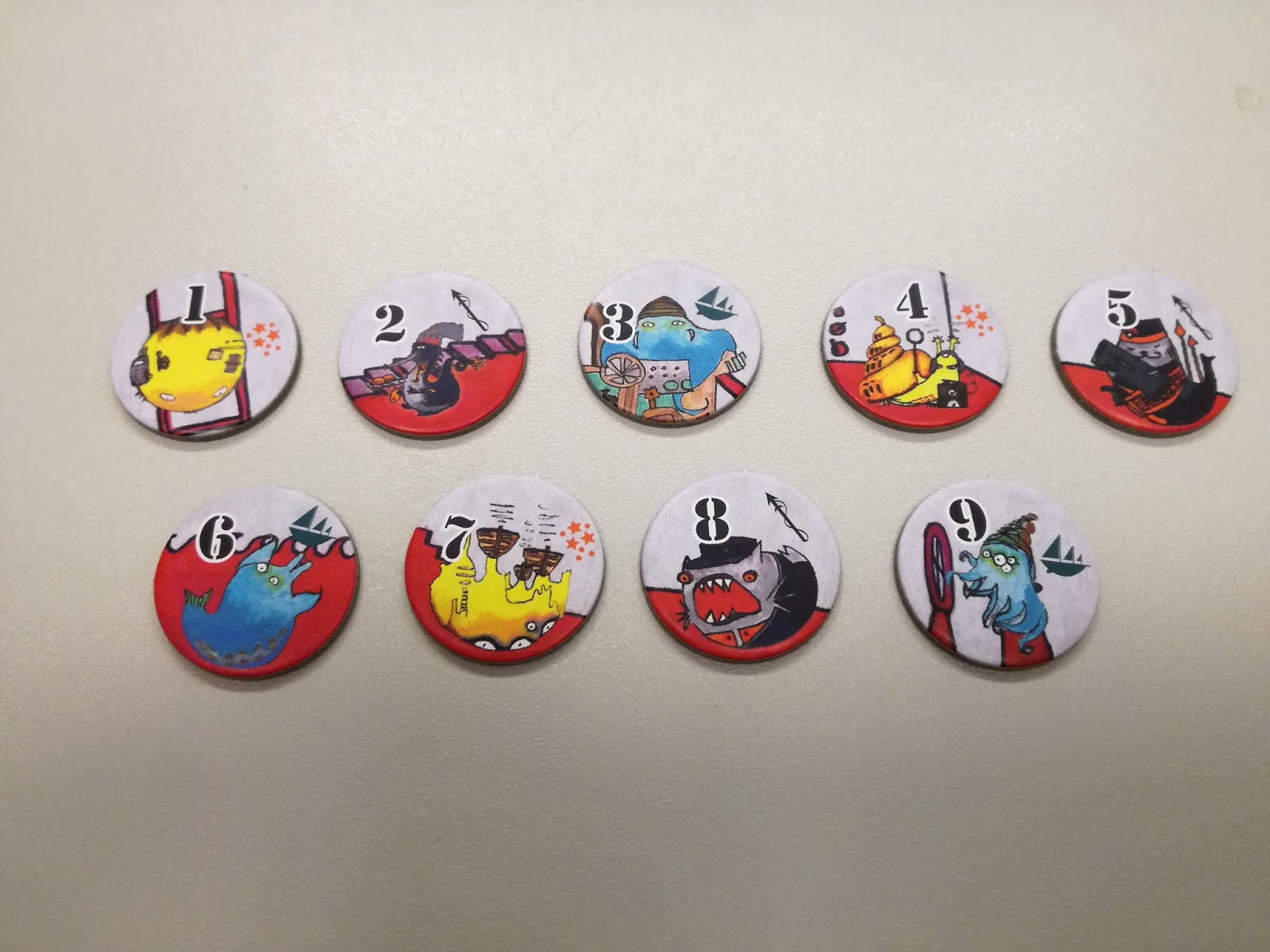Parmi ces extensions, on retiendra principalement « Les mercenaires ». Avec cette extension, vous serez amené à combattre le sous-marin fantôme : lors de la mise en place, on ajoute les pions mercenaires, des espèces de crevettes avec des harpons et on met en jeu également le plateau du sous-marin. A chaque fois que le sous-marin fantôme s’arrête sur un pion mercenaire, on le place sur le plateau et il en va de même pour les pions équipage de valeur 2, 5 et 8 (ce sont les seuls pions d’équipage qui possèdent un harpon). A notre tour, si nous nous arrêtons sur un pion mercenaire, ce pion devient une sorte de joker qui prend la place d’un membre d’équipage à bord du Nautilion. Au moment où les 2 vaisseaux se croisent, il y a confrontation : on compte le nombre de harpons que possèdent les 2 vaisseaux et :