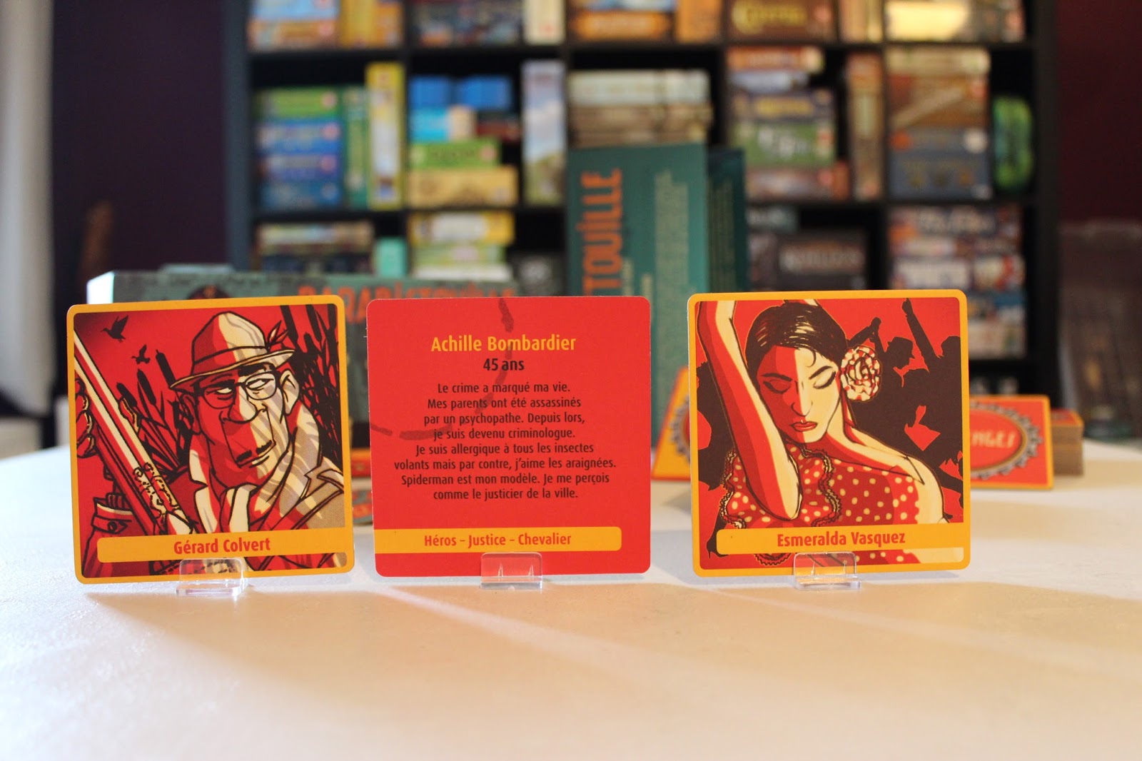 Parlons d’abord des illustrations de Pierre Dalla Palma, elles sont parfaites et collent parfaitement au thème du jeu. Personnellement, suis fan des couleurs choisies qui apportent une ambiance au jeu. Et quand on regarde les personnages, on en devine déjà beaucoup sur eux ce qui aide vraiment à la fluidité du jeu lors des évaluations car d’un regard, vous pourrez vous rappeler qui interprétait qui.