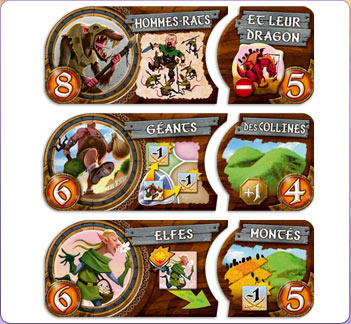6 peuples/pouvoirs seront visibles et disponibles en permanence, le 1er ne coûte rien, le 2ème coûte 1 pièce que vous poserez sur le 1er peuple car vous l’avez ignoré. Le 3ème coûte 2 pièces (1 pièce sur le 1er et le 2ème peuple), et ainsi de suite. Chaque joueur commence avec 5 pièces, et attention, ces pièces seront aussi vos PV !
