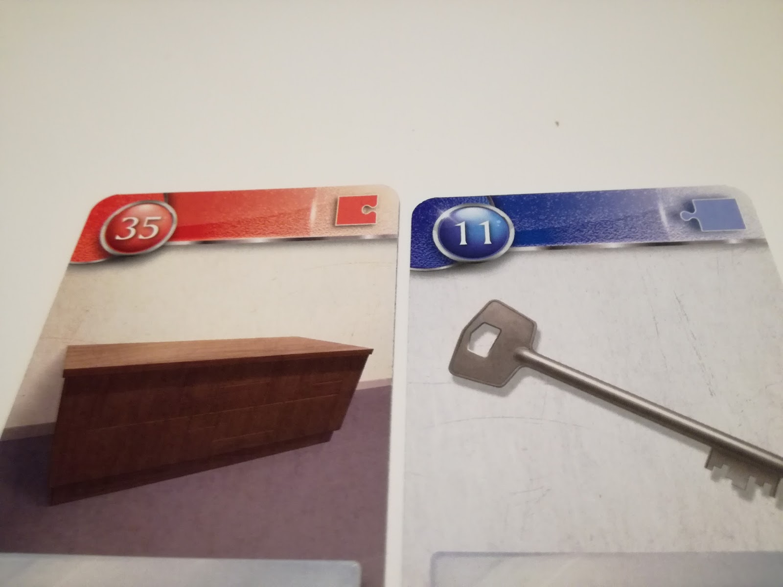 Dans une vraie escape, vous avez à interagir avec le décor ou des éléments tels qu’une corde ou encore des jumelles pour débloquer d’autres éléments ou trouver des codes. Evidemment, ici, ce n’est pas possible, toute la mécanique du jeu est basée sur des combinaisons de cartes. Chaque carte comporte un numéro ou une lettre et un code couleur : la couleur jaune signifie que vous devrez introduire une code dans l’application ; la couleur rouge indique que vous devrez trouver une carte comportant la couleur bleue pour pouvoir interagir avec cette carte : par exemple, vous trouvez un meuble qui comporte le chiffre 35 et la couleur rouge, si jamais vous tombiez sur une carte représentant une clé et comportant la couleur bleue, vous pouvez à ce moment décider de combiner ces 2 cartes en additionnant leurs deux chiffres, ce qui vous donnera la carte à aller chercher pour découvrir ce qu’il se passe. Evidemment, bien souvent, il y aura des modificateurs à ajouter pour trouver la bonne carte ;o).