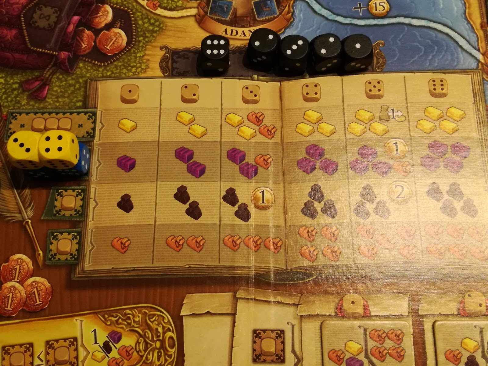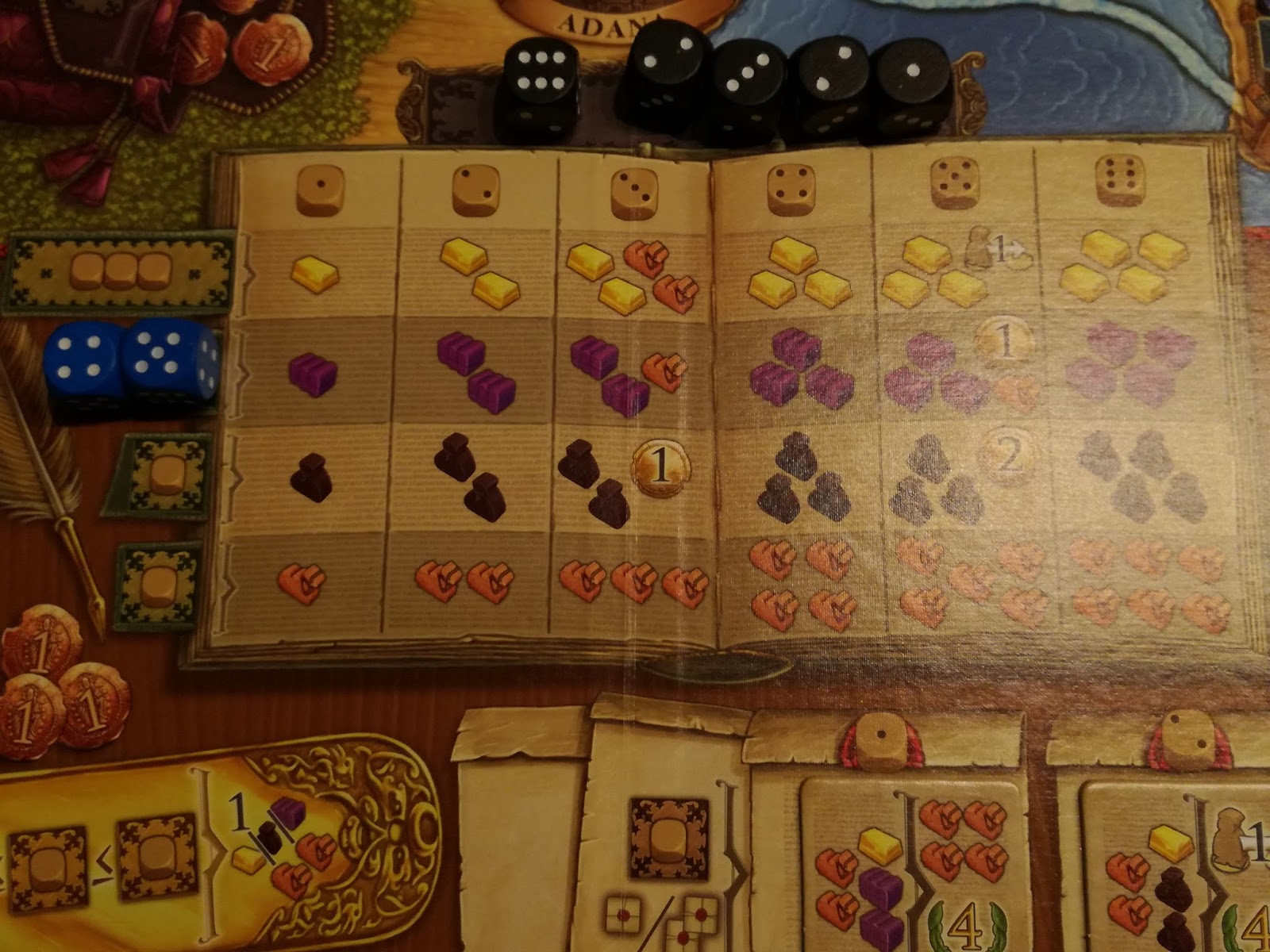 Seconde contrainte, là où ça devient vraiment intéressant, c’est que la « puissance » d’une action qui va vous demander, par exemple, 3 dés sera déterminée par la valeur du plus petit dé que vous aurez placé. Oula, ça demande un exemple : Ici, le joueur bleu envisage d’acquérir du tissu au Grand Bazar, pour cela, il doit jouer 2 de ses dés et place son « 4 » et son « 5 ». Mais, il ne récoltera que la récompense accordée dans la colonne numéro 4, à savoir 3 tissus.