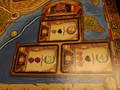 La ville de Sumatra est un peu particulière car elle vous permettra d’avoir accès non pas à une mais à trois cartes action. Dans le cas présent, vous pourrez échanger X fois 1 chameau et 1 épice contre 7 pièces d’or ; avec un autre dé, vous pourrez échanger 2 tissus contre 3 PV ou encore échanger 3 chameaux et 1 épice contre 4 PV.