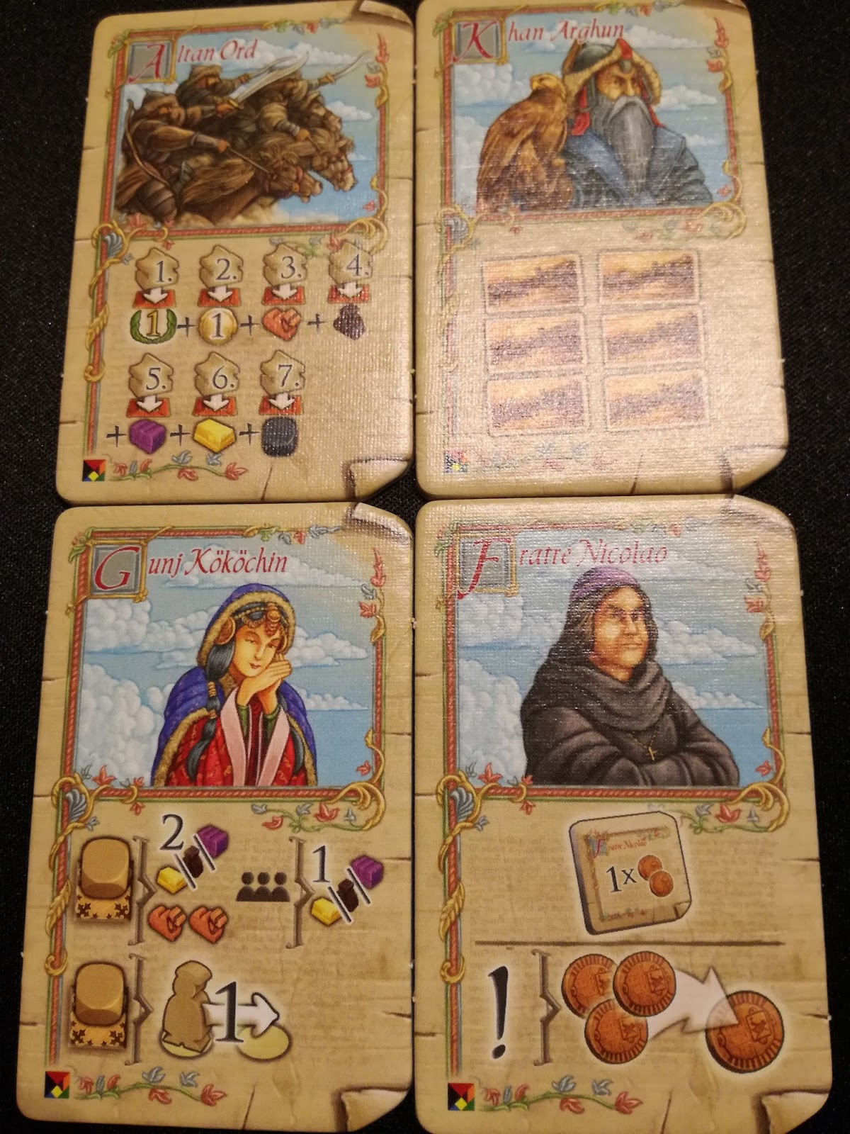Maintenant, on arrive à l’étape la plus importante de ce début de partie : nous allons choisir le personnage que nous allons incarner pour cette partie. Tous ces personnages « historiques » sont nombreux et très variés, ce qui apportera évidemment pas mal de variétés aux parties MAIS ils ont tous un point commun : ils sont tous extrêmement puissants ! Entre Matteo Polo qui jouera un dé supplémentaire ; Raschid ad-Din Sinan qui choisira la face de ses dés au lieu de les lancer ou encore le Marchand de Tabriz qui recevra une ressource dès que quelqu’un occupera le « Grand Bazar », ils sont vraiment tous intéressants et dirigeront un peu votre stratégie.