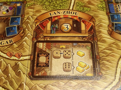 La ville de Lan-Zhou : le joueur arrivant en premier dans cette ville profitera aussi d’une tuile bonus lui donnant 3 pièces d’or en plus d’avoir accès à la carte action présente dans la ville.