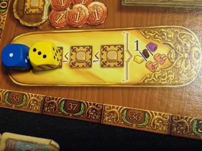 Ici, c’est assez simple, vous placez un unique dé et vous recevez 1 tissu, 1 épice ou 1 or et 2 chameaux. Il n’y a qu’une seule règle, la valeur du dé que vous placez doit être supérieure ou égale à la valeur du dé précédemment placé. Seconde exception concernant la règle de l’empilement, ici, point d’empilage de dés !