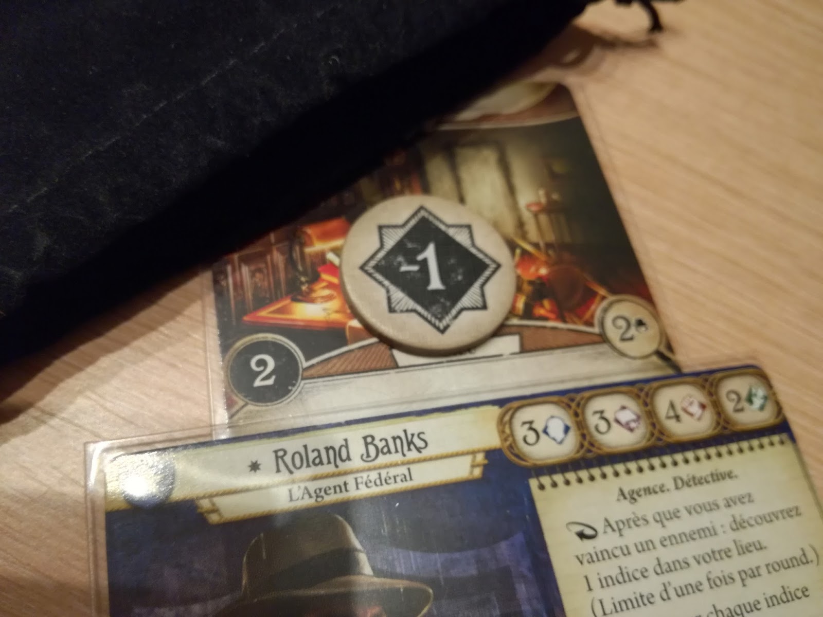 Il tire un « -1 » ce qui lui fait un total de 2, il égalise donc la valeur occulte et cela lui permet de prendre un indice du lieu.