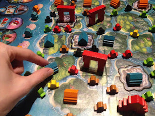 Par exemple, sur l’image ci-dessus, je pose mon bâtiment bleu qui agrandit un groupe, 5 bâtiments forment maintenant une chaîne, je prends donc 5 pièces. Aussi, je pose mon bâtiment à côté d’un torii, ce qui me permet de prendre un pion Prestige.