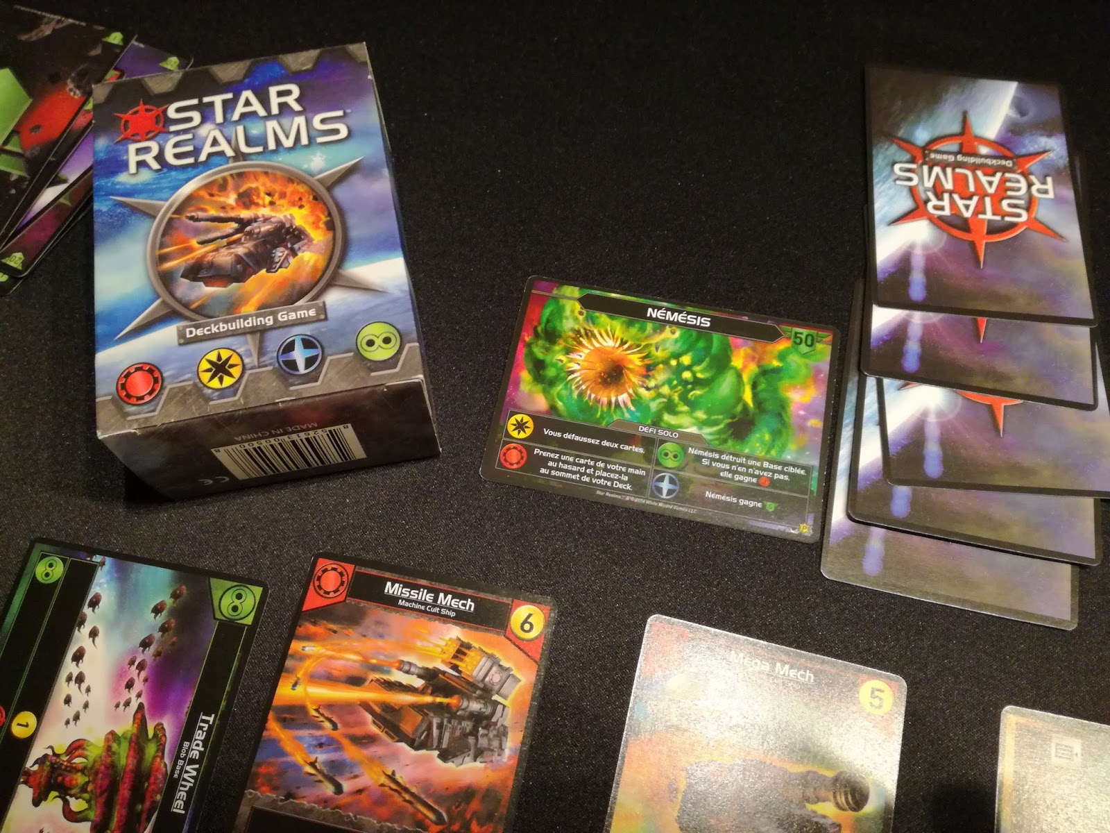 Sorti il y a déjà 2 ans, Star Realms continue à faire des émules grâce à sa sortie française fin 2016 : jeu de confrontation / deck-building pour 2 à 4 joueurs (4 joueurs avec 2 jeux de base) sur fond de bataille spatiale, le but est de tout simplement réduire les 50 points d’autorité de votre adversaire à zéro. A la base, il n’y a pas de mode solo mais parmi la pléthore d’extensions qui sont sorties, il y a eu l’extension « Gambit » qui vous propose une version solo avec 2 types d’adversaires : des Nemesis ou des Pirates. Pour ceux qui connaissent, on se retrouve un peu avec le système solo du jeu « Ascension » où la Nemesis fait défausser une des cartes du marché mais ici, elle est bien plus méchante car elle vous attaquera avec un effet dépendant de la carte qui va arriver. Néanmoins, j’ai trouvé cela un peu trop facile, peut-être ai-je eu un tirage favorable ? Probablement… malgré tout, le jeu se veut rapide et quand vous avez 30-45 minutes à tuer, c’est un excellent passe-temps et vraiment transportable partout.
