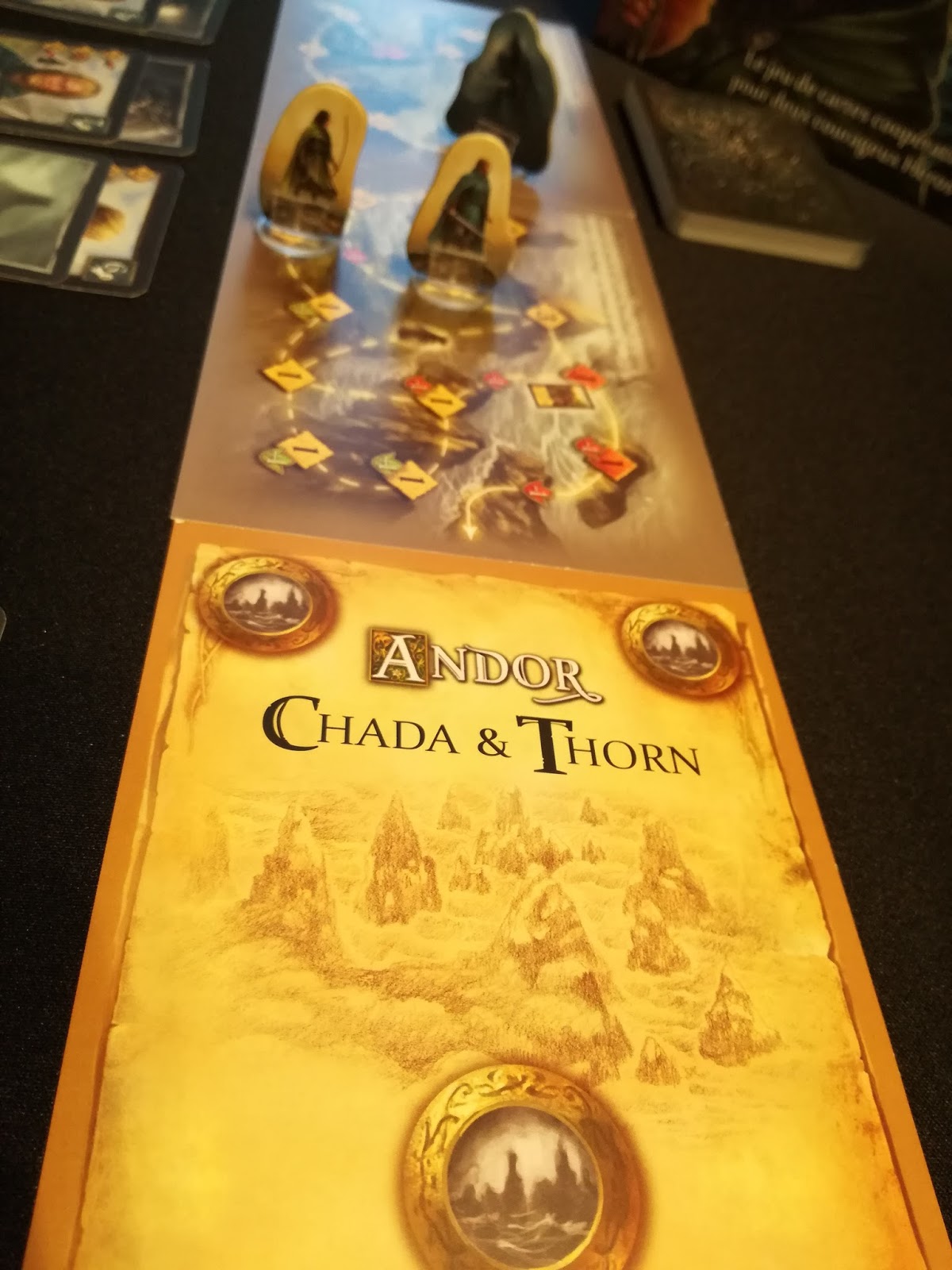 La version 2 joueurs « Des Légendes d’Andor » ! Evidemment, j’y joue seul. Une version solo officielle a été publiée sur le site de Iello, mais elle nécessite qu’on imprime et qu’on découpe les cartes, etc. Pas trop fan de ce genre de truc donc je m’en passe et le jeu tourne très bien en dirigeant les 2 héros. Chada et Thorn ont échoué sur une île mystérieuse lors du voyage retour vers le royaume d’Andor. A vous de les faire traverser cette île au travers de 6 scénarios composés de grandes cartes qui forment votre parcours. Au cours de votre traversée, vous serez pourchassé par un fantôme qui ne vous voudra pas du bien, ainsi que par bien d’autres choses. Chaque personnage est représenté par 3 cartes possédant chacune des actions bien spécifiques. Quand vous aurez activé une carte, vous devrez la mettre en-dessous de sa pile, révélant la carte suivante vous permettant de faire autre chose, à moins que vous ne tombiez sur un ennemi ou une carte malédiction. C’est malin, c’est calculatoire, la patte de Mr Menzel fait mouche comme d’habitude et ils ont la bonne idée de mettre plusieurs cartes « trajets » pour chaque scénario, du coup, ça donne un peu de renouvellement à la chose.