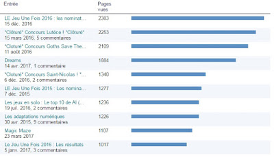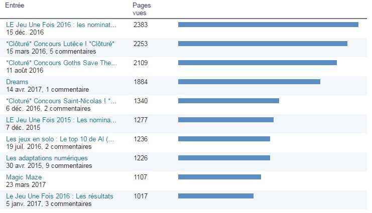 Si on regarde rapidement les stat’, on s’aperçoit que les concours remportent un franc succès en terme de vues sur le site (3 concours placés dans le top 10 des pages vues) et là, maintenant, vous aurez peut-être envie de crier : « Mais… mais… oui… d’ailleurs, ça fait longtemps qu’il n’y a pas eu de concours !!!! »