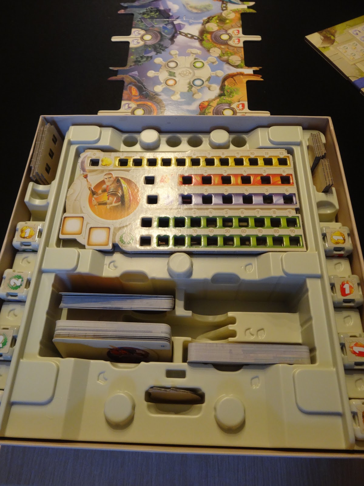 Car l’intérieur impressionne encore plus avec un thermoformage quasi parfait. Oui, quasi, je chipote mais je ne vois pas l’intérêt des emplacements pour les mini-tokens et les afficionados des sleeves devront un peu chercher pour trouver la taille parfaite pour les cartes qui doivent rentrer dans la boîte et dans les emplacements du plateau de jeu.
