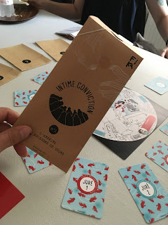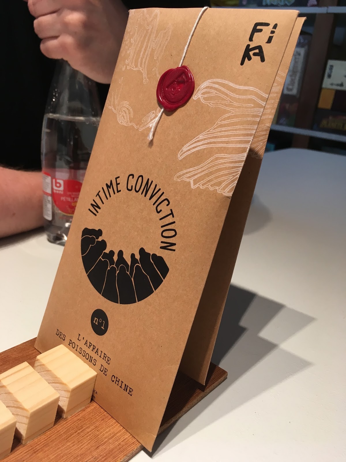 Parlons d’abord de FIKA. Les 2 fondateurs Raphaël Vanleemputten (Jafar) & Céline Pieters (Guida) ont posé les bases du projet lors d’un voyage en Suède pendant une pause-café appelée là-bas : Fika. C’est une SPRL qui existe depuis décembre 2016 (et oui, c’est tout frais). Le premier jeu qu’ils nous proposent est « Intime conviction », et le concept se déclinera en différentes affaires qui porteront un numéro différent. Actuellement, la première est disponible à la vente et la seconde est en test.