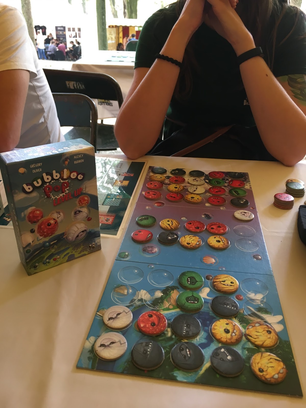 # Bubblee Pop Level Up (VaL) : Vous connaissez les Bubblee Pop de chez Bankiiiz ? Voici une petite extension pour renouveller un peu ce petit jeu à 2 bien sympa, Al en avait d’ailleurs fait un coup de cœur à (re)lire ici. 2 nouvelles familles de Bubblees apparaissent : les blancs et les orange, qui apportent de nouveaux pouvoirs. Les blancs : Permettent d’ajouter un Bubblee noir dans le jeu adverse, en partant d’en dessous. Les orange : Permettent de remettre dans le sac un Bubblee de votre adversaire, que ce soit depuis son monde ou sa zone de score. 7 familles sont désormais disponibles, choisissez-en 5, et c’est parti ! Si vous aimiez Bubblee Pop, Bubblee Pop Level Up finira rapidement dans votre ludothèque 😉