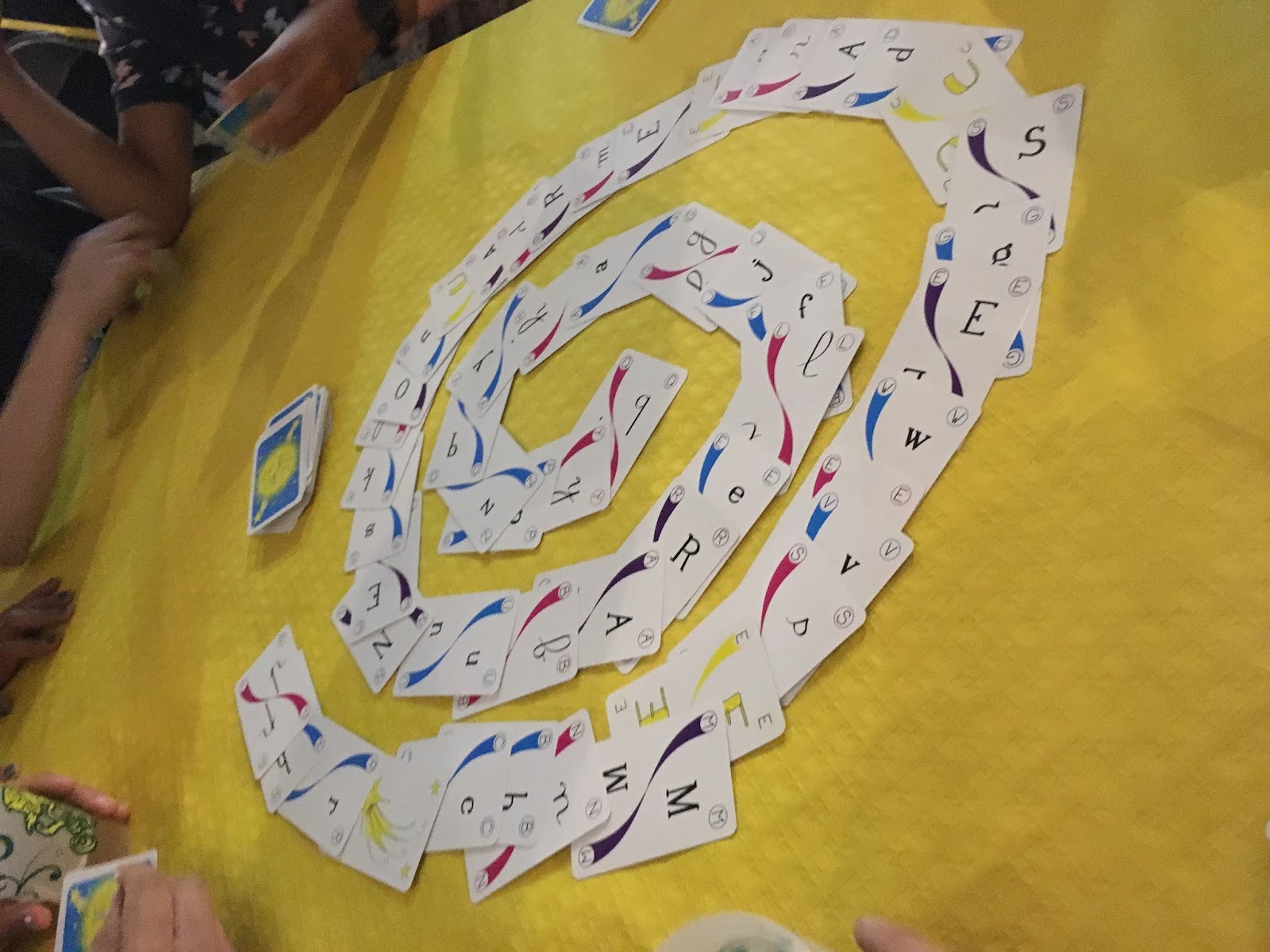# Toutilix(Cowmic) : Une belle surprise… Nous avons rencontré Christine Larquetout lors de la soirée presse et décidé de lui rendre visite samedi. On se laisse tenter par une partie, on rit, on s’amuse et on adore. Toutilix, ce n’est pas 1 jeu mais 35 jeux dans une boîte. Le matériel permet de jouer à 14 adaptations de jeux historiques (7 Familles, Bataille Corse, …) et 21 jeux originaux. On joue avec les lettres, les mots et les phrases. De 1 à 8 joueurs, de 10 à 60 minutes. On en a testé 2 originaux et on a beaucoup ri (Spiralix et Frazrigolix). Le soir au OFF, on a sorti une boîte, les parties se sont enchaînées et l’ambiance est montée d’un cran. Pour vous donner le ton, dans Spyralix, vous devrez trouver un mot qui commence par la carte précédemment posée et contenant la lettre que vous venez de poser (dans la continuité de la spirale). Si un des autres joueurs trouve avant vous, il commence à décompter à voix haute de 10 à 0 et si vous ne trouvez pas, il annonce son mot et vous récupérez toutes les cartes jouées. Le but étant de se débarrasser de celles qu’on a en premier. Ça vous donne une idée. Je ne suis pourtant pas fan des jeux de mots ou de lettres mais si il ne devait y en avoir qu’un, ça serait celui-là.