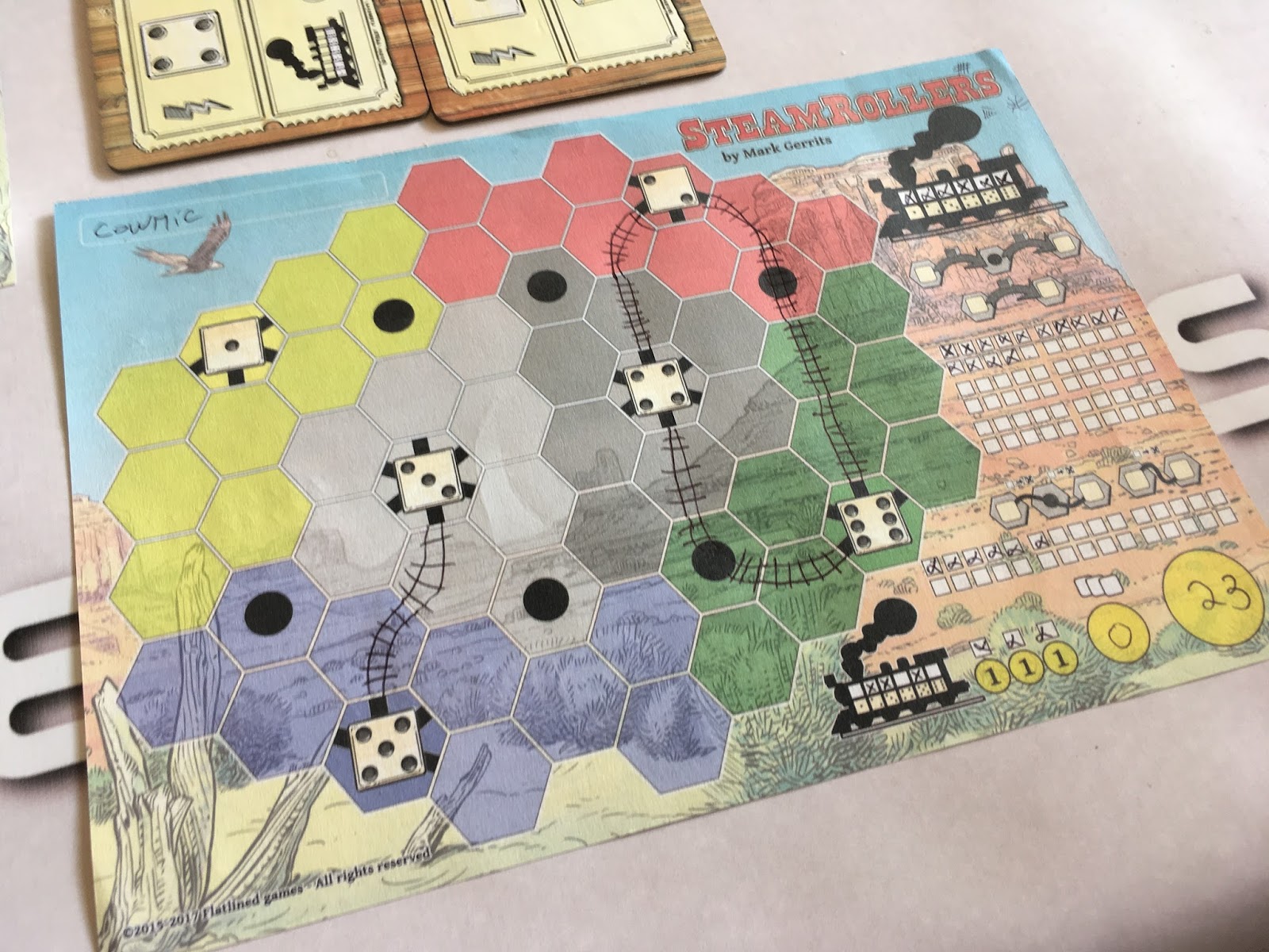 C’est le même but, le même principe mais heureusement, c’est tout de même différent ;o) Bon déjà, dans SR (SteamRollers), il y a des dés mais surtout, là où Steam peut rebuter par son côté « lourd » et « long », SR rafraîchit en étant plus accessible et jouable en moins d’une heure.