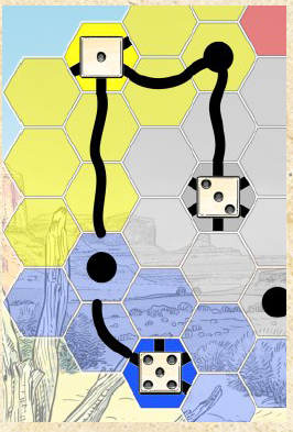 Si par exemple, un cube jaune se trouve dans la ville « 3 », le joueur peut prendre un dé « 3 » pour transporter ce cube jusqu’à la ville de sa couleur.