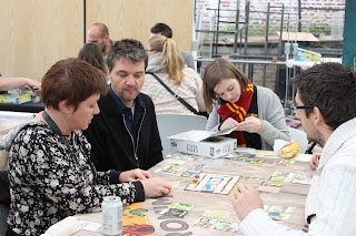 Un tournoi de Paper Tales étant prévu pour un peu + tard, nous étions curieux du jeu présenté par le distributeur Geronimo. Une agréable explication rapide et efficace des 6 phases du jeu, nous voilà lancés. Le jeu allie stratégie et rapidité; les phases s’enchaînant en 4 tours et cela s’arrête, juste ce qu’il faut pour que celui ayant remporté le + de légende.