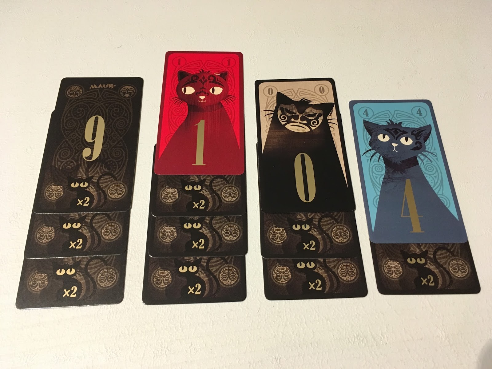 Toutes les cartes ont le même dos appelé Mauw sur lequel se trouve la valeur 9 (les 9 vies du chats) et un multiplicateur x2.