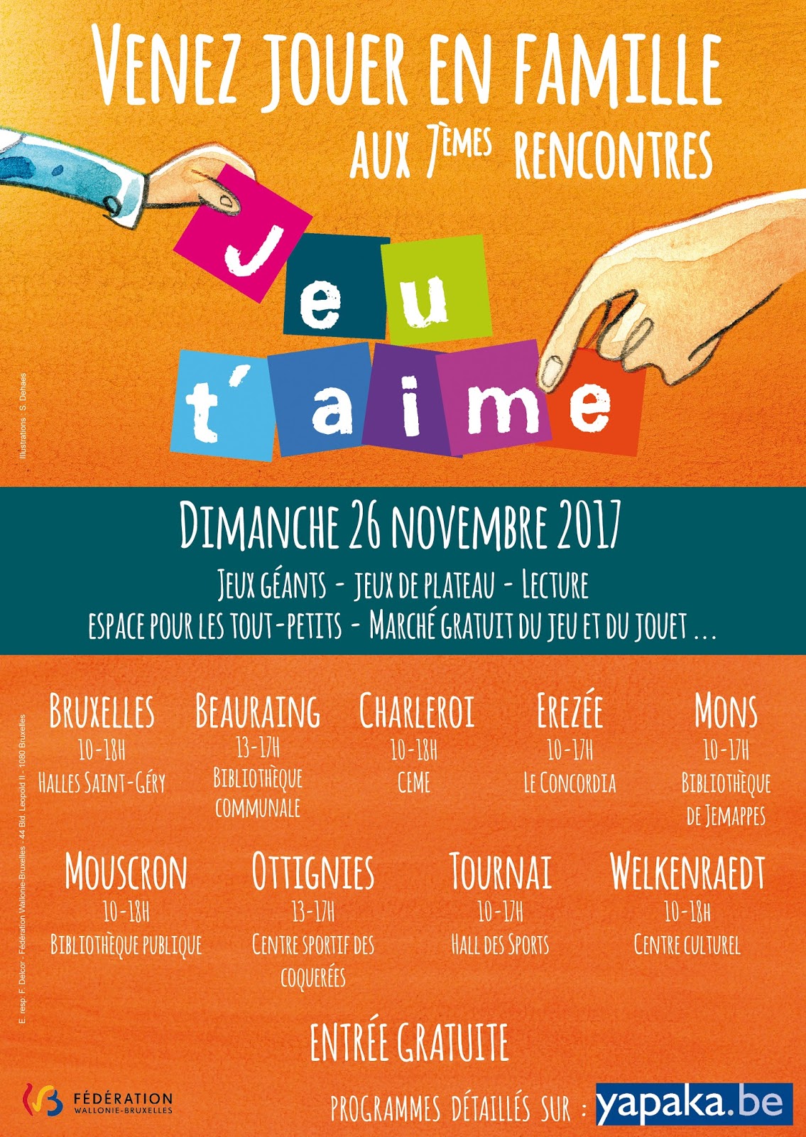 « Venez jouer et partager un chouette moment en famille lors de la 7ème édition des Rencontres « Jeu t’aime » le dimanche 26 novembre 2017. » Quelle meilleure invitation pourrions nous tous avoir pour ce dimanche ? Partout en fédération Wallonie Bruxelles, Yapaka.be lance la campagne « Jeu t’aime » 7ème du nom !