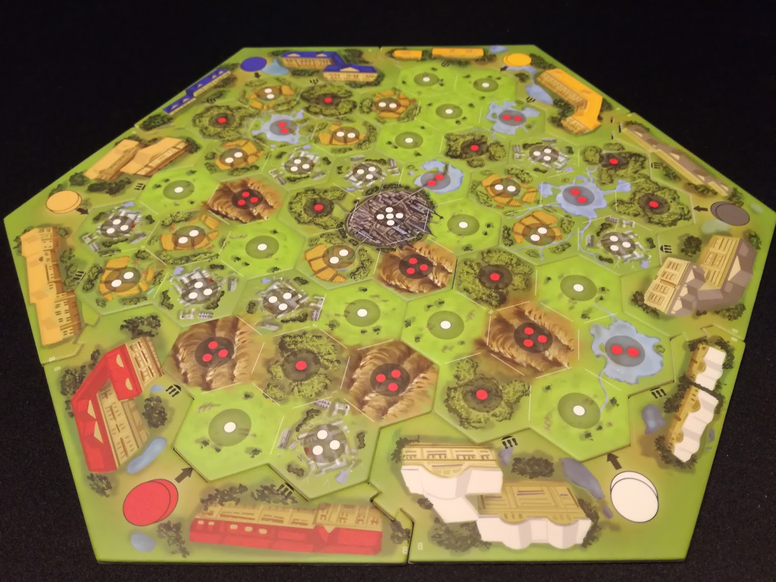 Sur le plateau, chaque emplacement est déterminé par un nombre de points blancs ou rouges. A chaque fois, que vous placerez un Chemin de Fer sur un emplacement « Blanc » vous ferez augmenter la valeur de la couleur de ce disque d’un montant égal au nombre de points blancs présents sur l’hexagone. A l’inverse, les emplacements « Rouges » diminueront sa valeur. Et ceci est valable pour tous les joueurs, c’est là tout l’intérêt ^_^.