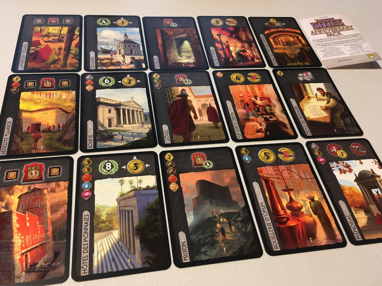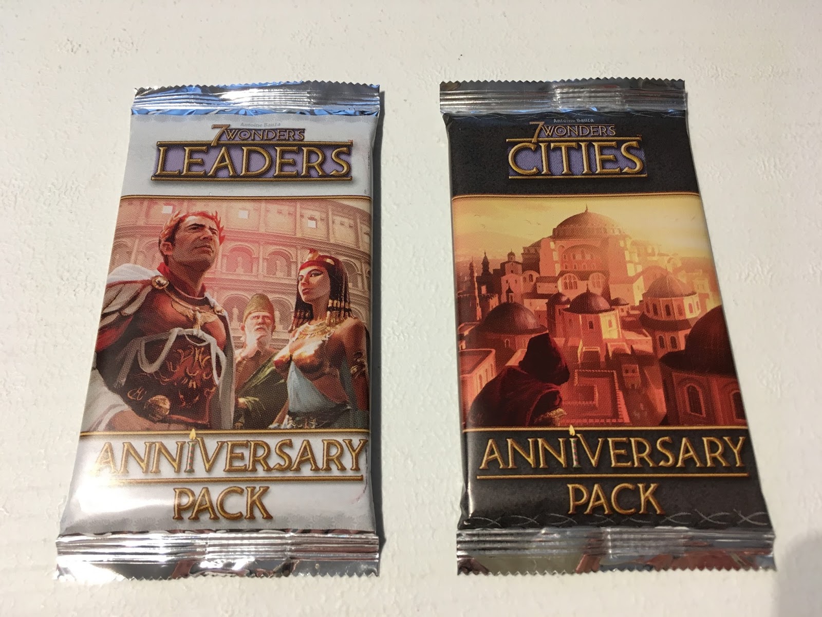 7 Wonders fête cette année ses 7 ans et pour l’occasion, Repos Production a sorti 2 Anniversary Packs. Un pour l’extension Leaders, un pour l’extension Cities. Il s’agit en fait d’un booster de 15 cartes pour chacune de ces 2 extensions. Ces deux séries de cartes arborent un logo 7 bougies en bas pour pouvoir les identifier.