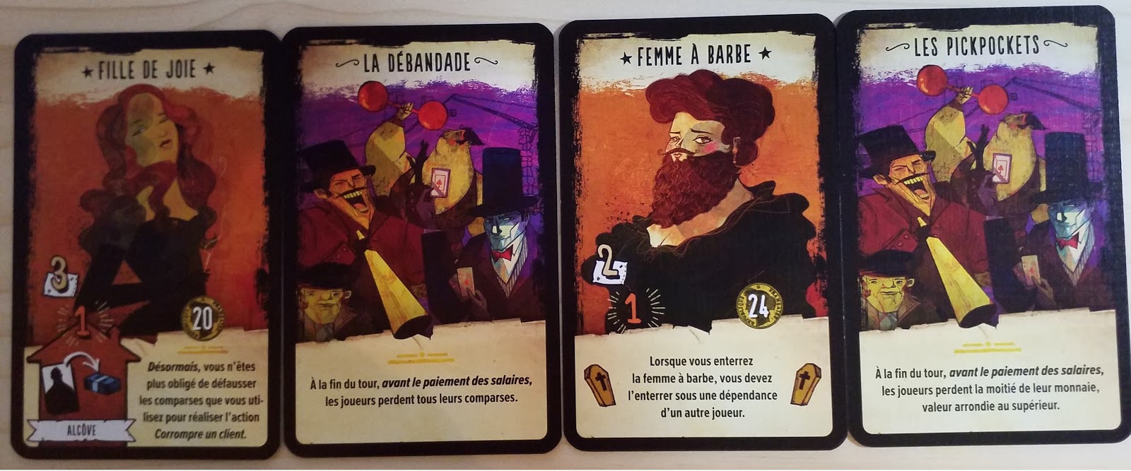 Ce premier module : les forains s’ajoute aux cartes de base. Il ajoute donc un peu de temps de jeu mais surtout en nouvelles possibilités par leurs effets propres ou communs. Il y aura tout d’abord une nouvelle dépendance : la roulotte qui permet d’accueillir un client supplémentaire tant qu’aucun cadavre ne vient à y être planqué (ça ne passe pas, sans doute à cause de l’odeur) Nain, femme à barbe, jumelles seront plus ou moins difficiles à enterrer. Bâtir la cage de l’ours vous aidera à tuer des clients tandis que construire l’Alcôve de la Fille de joie modifiera totalement vos futures corruptions.