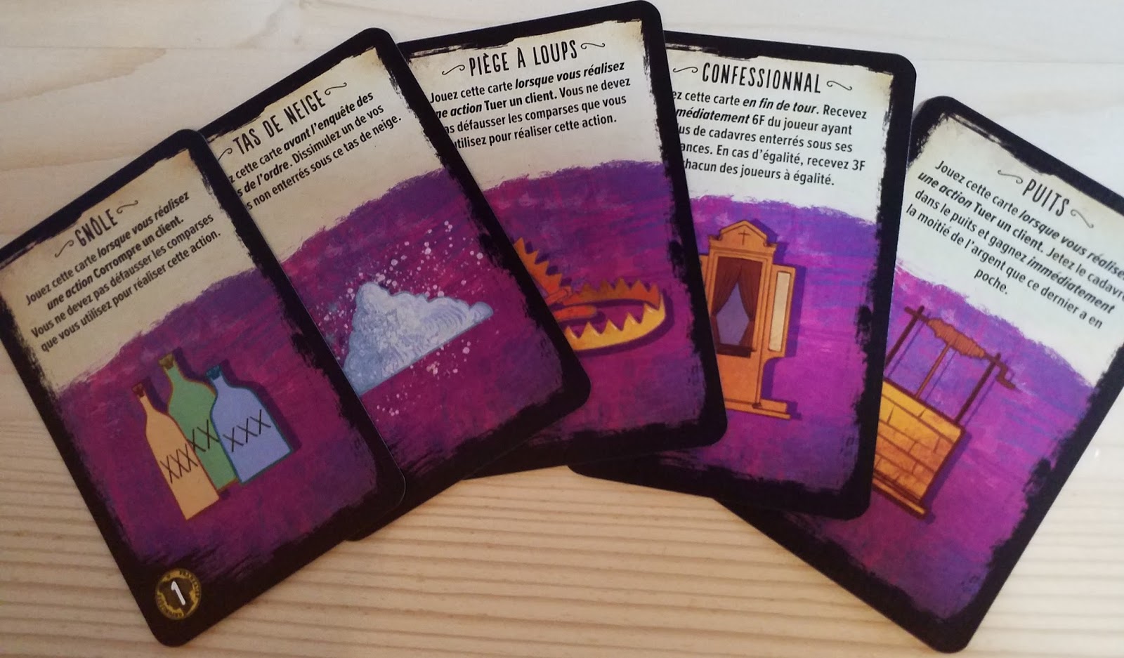 Enterrer un client : placer l’un de vos cadavres (carte face « mort » devant vous) sous l’une des dépendances libres et surtout récupérer l’argent des poches du (prématurément) décédé.