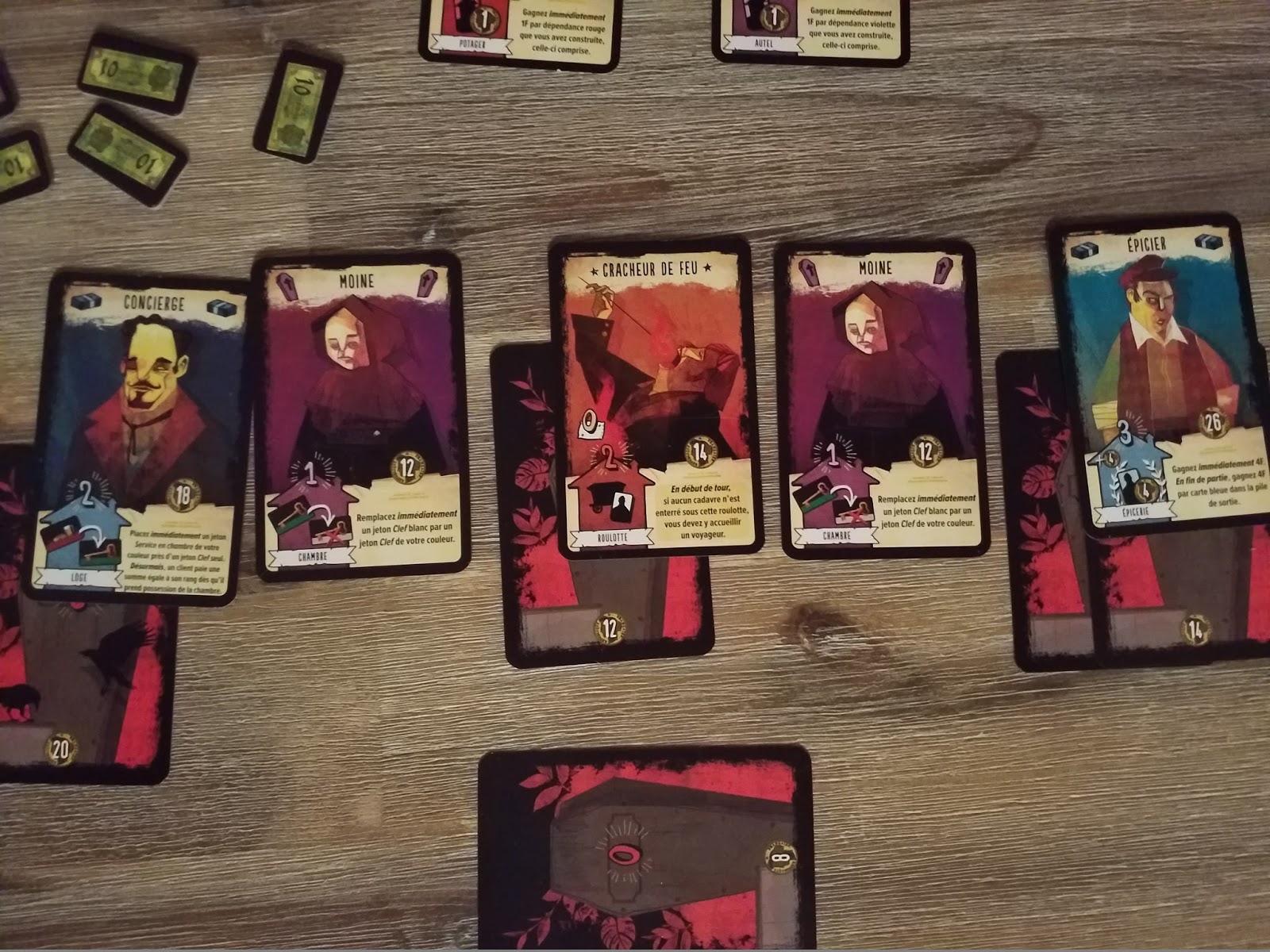 A chaque tour, l’auberge va accueillir les voyageurs qui seront placés par le 1er joueur du tour en cours. Ensuite, à tour de rôle, chaque aubergiste va jouer sa 1ère action puis chacun sa seconde. Les survivants à la nuit s’en vont à la défausse au petit matin mais avant, s’il y en a, les forces de l’ordre vérifieront que vous n’avez pas de cadavres non enterrés et les clients de vos chambrées vous payeront leur nuit. Vous terminez par régler le salaire de vos comparses.