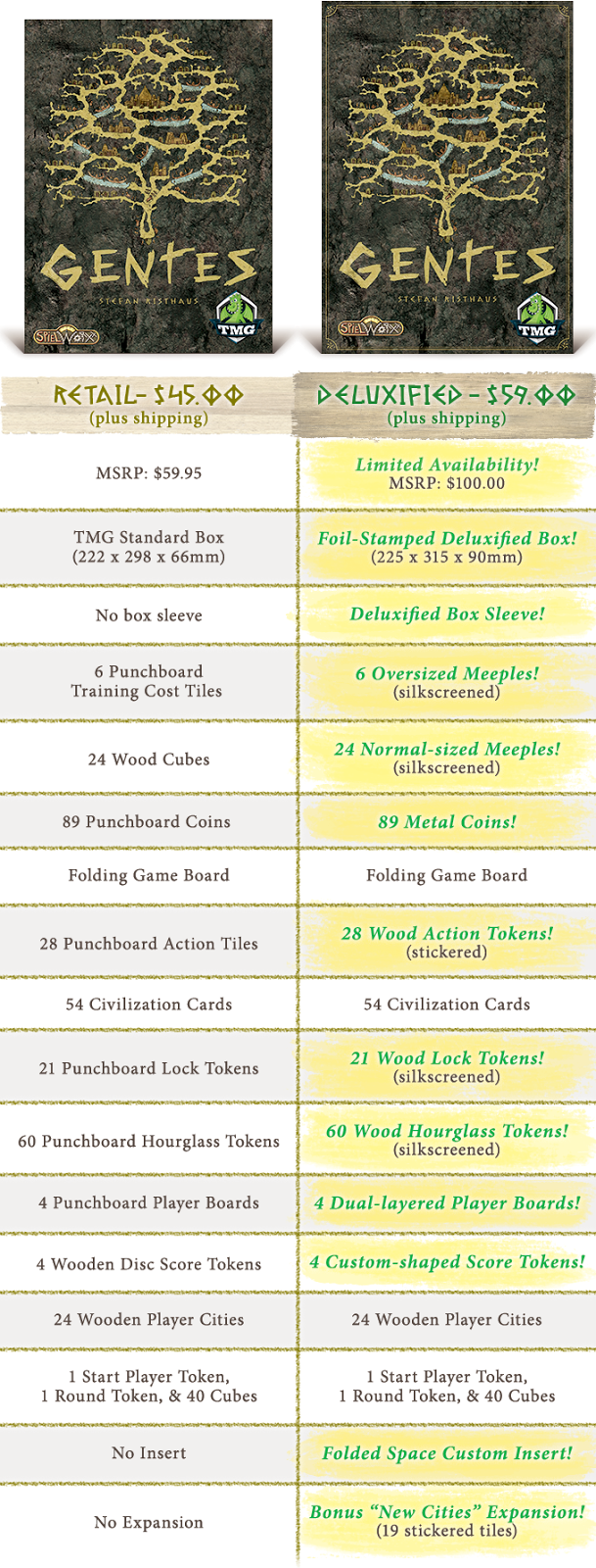 Ici, Game Brewer propose la version multi-langues de Gentes, une édition de luxe. Vu le prix, le matériel, le nombre de personnes engagées… j’ai bien l’impression que c’est un projet qui vaut la peine d’être soutenu. Sans oublier que c’est l’occasion d’avoir une localisation en Europe du jeu et en prime en français. Encore une fois, j’ai avant tout envie de soutenir Game Brewer qui, d’après ce que j’en sais, a beaucoup d’ambition en matière de sorties une fois.